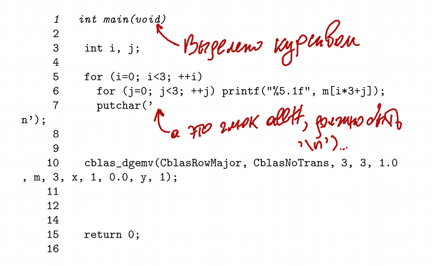 \documentclass[a4paper,10pt]{article} \usepackage[T2A]{fontenc} \usepackage[koi8-r]{inputenc} \usepackage[usenames,dvipsnames]{color} \usepackage{alltt} \begin{document} \section{C code via alltt} \begin{alltt} \textit{1 int main(void)} 2 { 3 int i, j; 4 5 for (i=0; i<3; ++i) { 6 for (j=0; j<3; ++j) printf("%5.1f", m[i*3+j]); 7 putchar('\\n'); 8 } 9 10 cblas_dgemv(CblasRowMajor, CblasNoTrans, 3, 3, 1.0 , m, 3, x, 1, 0.0, y, 1); 11 12 14 15 return 0; 16 } \end{alltt} \end{document}